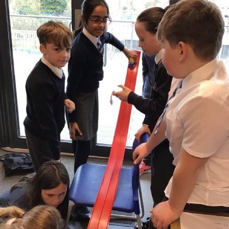 We made parachutes to test the effect of air resistance and experimented with adding oil to a track to reduce friction on moving cars.